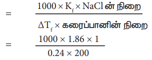 200 கிராம் நீரில் 1 கிராம் NaCl ஐ கரைப்பதன்மூலம், 0.24 K உறைநிலைத் தாழ்வு ஏற்படுத்தப்பட்டது. வாண்ட்ஹாஃப் கரணியைக் கணக்கிடுக. மோலால் உறைநிலைத் தாழ்வு மாறிலி மதிப்பு 1.86 K Kg mol-1