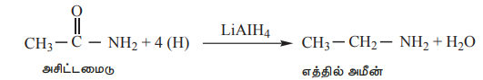 அமைடுகளை, LiAlH4 அல்லது சோடியம்- எத்தனால் கலவை கொண்டு ஒடுக்கும்போது அமீன்கள் உருவாகின்றன.