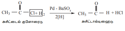 (அ) இவற்றை, நச்சுப்படுத்தப்பட்ட பெல்லாடியம் வினைவேக மாற்றி முன்னிலையில் ஹைட்ரஜன் கொண்டு ஒடுக்கும்போது ஆல்டிஹைடுகளை தருகின்றன. இந்த வினையானது ரோசன்முன்ட் ஒடுக்கவினை என்றழைக்கப்படுகிறது. ஆல்டிஹைடுகளின் தயாரிப்பு முறைகள் எனும் தலைப்பின்கீழ் இந்த வினையை நாம் ஏற்கனவே கற்றறிந்தோம்.