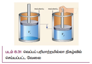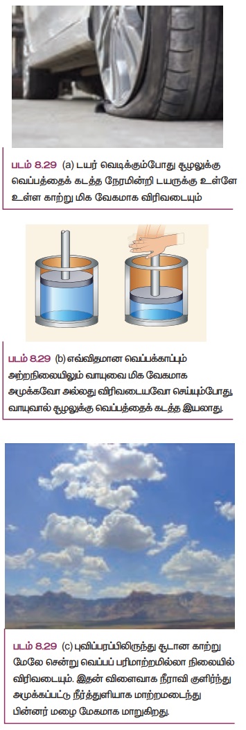 எடுத்துக்காட்டாக, வெப்பக்காப்பு செய்யப்பட்ட உருளையில் உள்ள வாயு வெப்பப்பரிமாற்றமில்லா முறையில் அமுக்கப்படுகிறது அல்லது வெப்பப்பரிமாற்றமில்லா முறையில் விரிவடைகிறது. இது படம் 8.28 இல் காட்டப்பட்டுள்ளன.
