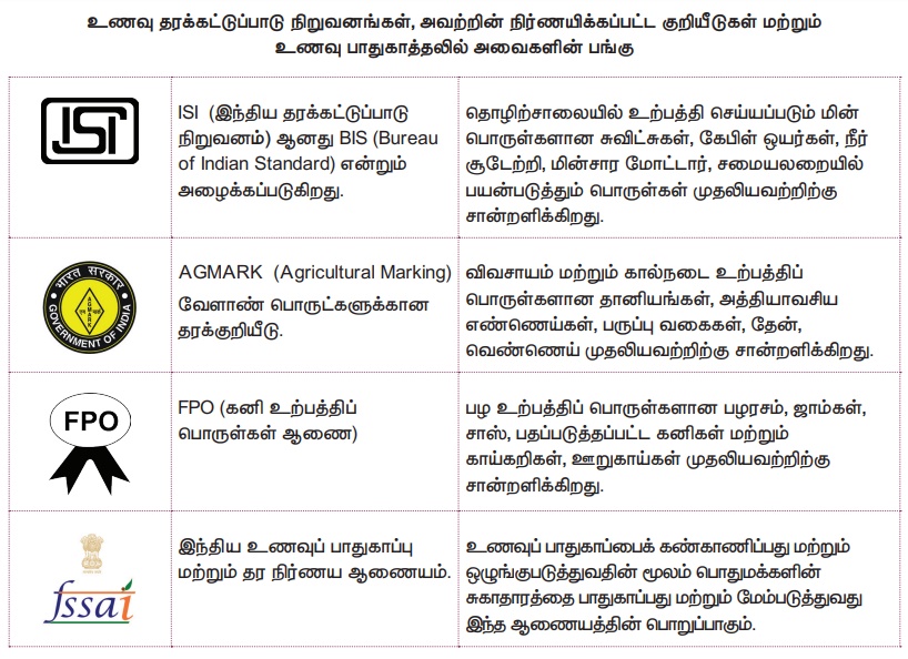 ஒவ்வொரு மாணவனும் ஏதாவது ஒரு உணவுப் பொட்டலத்தை (ஜாம், பழரசம், ஊறுகாய், ரொட்டி, பிஸ்கட் முதலியவை) கொண்டு வரவும். அந்தந்த உணவின் பெயர், தயாரிப்பாளருடைய விவரங்கள், அதில் அடங்கியுள்ள பொருள்கள், மொத்த எடை, அதிகபட்ச விற்பனை விலை, காலாவதி நாள், அந்த உணவைக் குறித்து விழிப்புணர்வு ஏற்படுத்த தர நிர்ணயம் செய்த விநியோக நிறுவனத்தின் அச்சிடப்பட்ட குறியீடுககளான ISI,