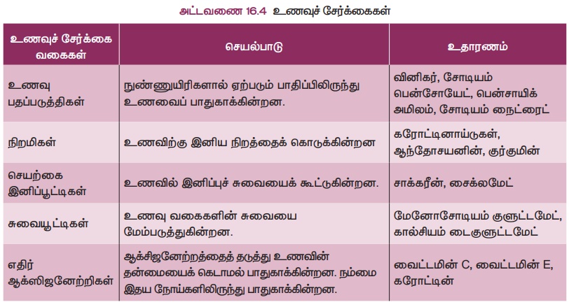 உணவுச் சேர்க்கைகள்: இவை ஒரு சில சிறப்பான செயல்பாடுகளுக்காக உணவில் சேர்க்கப்படும் வேதிப்பொருட்கள் ஆகும். பல்வேறு வகையான உணவுச் சேர்க்கைகள் அட்டவணை 16.4 ல் கொடுக்கப்பட்டுள்ளன.
