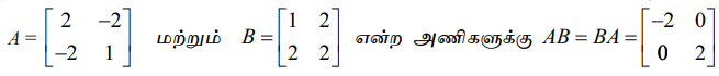 (iii) A ≠ 0 மற்றும் B ≠ 0 ஆக இருந்து AB = 0 ஆக வாய்ப்புள்ளது. அதாவது, AB = 0 எனில், A = 0 அல்லது B = 0 ஆக இருக்க வேண்டிய அவசியமில்லை. எடுத்துக்காட்டாக,