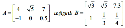 (3) கீழே கொடுக்கப்பட்டுள்ள அணிகளின் கூட்டல் மற்றும் பெருக்கல் செயல்களுக்கு உகந்த ஏதேனும் இரு அணிகள் A மற்றும் B−க்குப் பொதுவாக