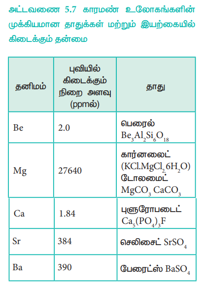 அட்டவணை 5.7 காரமண் உலோகங்களின் முக்கியமான தாதுக்கள் மற்றும் இயற்கையில் கிடைக்கும் தன்மை