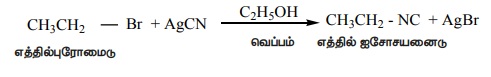 எத்தில் புரோமைடை எத்தனால் கலந்த AgCN உடன் வினைபடுத்தும் போது எத்தில் ஐசோ சயனைடு மிகையளவு உருவாகும் இவ்வினையில் எத்தில் சயனைடு குறைந்த அளவு உருவாகும் விளைபொருளாகும்.