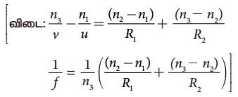 5. இடது பக்கம் n1 ஒளிவிலகல் எண் கொண்ட ஊடகத்தையும் வலது பக்கம் n3 ஒளிவிலகல் எண் கொண்ட ஊடகத்தையும் பிரிக்கும் வகையில், n2 ஒளிவிலகல் எண் கொண்ட லென்ஸ் ஒன்று வைக்கப்பட்டுள்ளது. இந்த லென்ஸிற்கான லென்ஸ் உருவாக்குபவரின் சமன்பாட்டை பெருக?