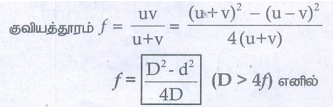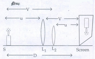 7. குவிலென்ஸின் குவியத்தொலைவைப் போன்று 4 மடங்கு தொலைவில் அதாவது, D தொலைவில் பொருளும் திரையும் பிரித்து வைக்கப்பட்டுள்ளன. இணை குவிய முறையின்படி (Conjugate foci method) பொருளுக்கும் திரைக்கும் நடுவே இரண்டு நிலைகளில் குவிலென்ஸை வைத்து பிம்பத்தை உருவாக்கலாம். இவ்விரண்டு நிலைகளுக்கு இடையே உள்ள தொலைவை f எனக் கொண்டு, குவிலென்சின் குவியத்தூரத்திற்கான சமன்பாட்டை வருவி