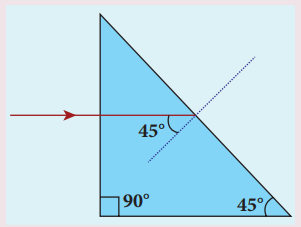 சமபக்க முப்பட்டகம் ஒன்றின் முதல் முகத்தில் அல்லது முதல் பரப்பின் மீது செங்குத்துப் படுகோணநிலையில் ஒளிக்கதிரொன்று விழுந்து, முப்பட்டகத்தின் வழியாக சென்று இரண்டாவது முகத்தினைத் தழுவிச்செல்கிறது எனில், முப்பட்டகம் ஏற்படுத்திய திசை மாற்றக் கோணம் எவ்வளவு? மேலும், முப்பட்டகப்பொருளின் ஒளிவிலகல் எண்ணைக் கணக்கிடுக.