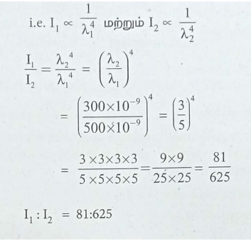 10. இராலே ஒளிச் சிதறலை தோற்றுவிக்கும் 500nm மற்றும் 300nm அலைநீளம் கொண்ட இரண்டு ஒளிக்கதிர்களின் செறிவுகளின் விகிதத்தைக் காண்க.