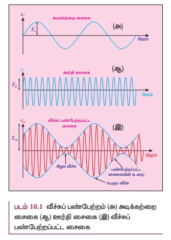 படம் 10.1(இ) இல் வீச்சுப் பண்பேற்றப்பட்ட சைகை ஆகியவை தரப்பட்டுள்ளன. அடிக்கற்றை சைகையின்