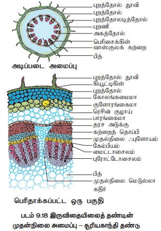 இருவிதையிலைத் தண்டு பண்புகள் : புறணி, அகத்தோல், பெரிசைக்கிள், பித் என வேறுபட்டு காணப்படுகிறது.