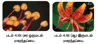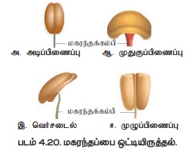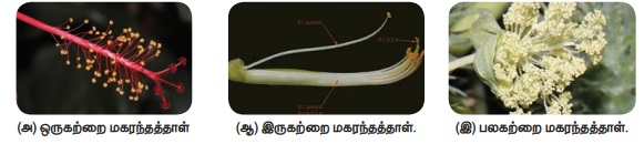 ஈ. பொலினியம் : மகரந்தத்தூள்கள் ஒன்றாக இணைந்து ஒரே தொகுப்பாகக் காணப்படும். எடுத்துக்காட்டு: கலோடிராபிஸ்