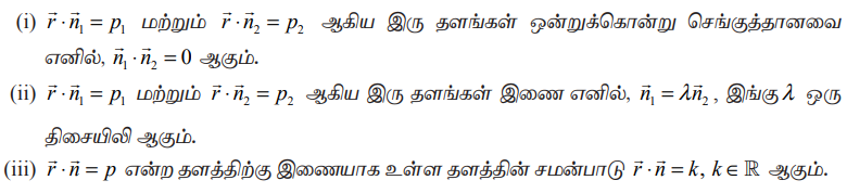 (i) a1x + b1y + c1z + d1 = 0 மற்றும் a2x + b2y + c2z + d2 =0 என்ற தளங்கள் ஒன்றுக்கொன்று செங்குத்து எனில், a1a2 + b1b2 + c1c2 = 0 ஆகும்.