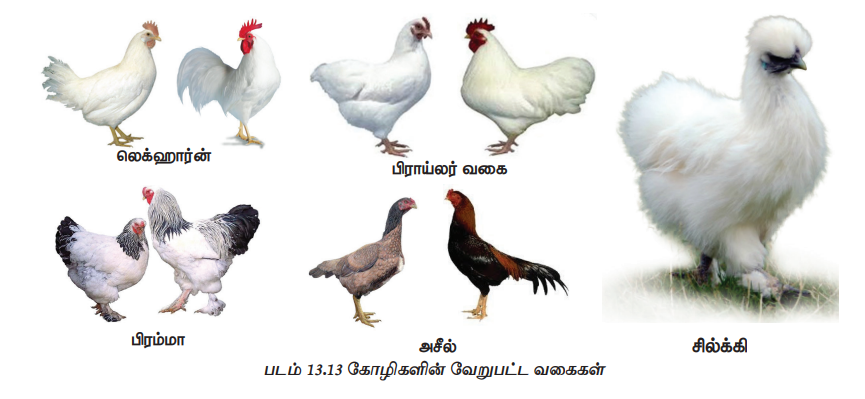 நூற்றுக்கும் மேற்பட்ட கோழி இனங்கள் உள்ளன. அவற்றின் பயன்பாட்டினைப் பொறுத்துகோழிகளை ஐந்து வகைகளாகப் பிரிக்கலாம். அவை, முட்டையிடுபவை, கறிக்கோழி அல்லது இறைச்சி வகை, இரு பயன்பாட்டு வகை, விளையாட்டு வகை மற்றும் அலங்கார வகை ஆகியன (படம் 13.13).