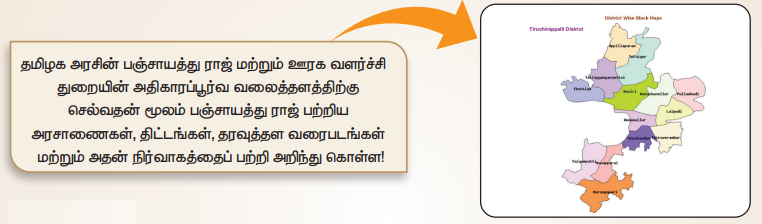 1. உன் உள்ளாட்சி அமைப்பு பிரதிநிதியைச் சந்தித்து உள்ளாட்சி அமைப்புகள் எவ்வாறு நிர்வகிக்கப்படுகின்றன என்ற விவரங்களை சேகரி.