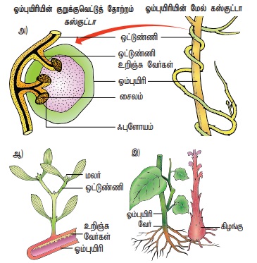 51. பல்வேறு வகையான ஒட்டுண்ணிகளைப் பற்றி தொகுத்து ஓம்புயிரியின் குறுக்குவெட்டுத் தோற்றம் ஓம்புயிரியின் மேல் கஸ்குட்டா எழுதுக.