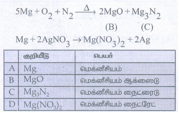 35. மூன்றாம் வரிசையை சேர்ந்த காரமண் உலோகம் (A), ஆக்ஸிஜன் மற்றும் நைட்ரஜனுடன் வினைப்பட்டு முறையே சேர்மங்கள் (B) மற்றும் (C) ஐ தருகின்றன. இது AgNO3 கரைசலுடன் உலோக இடபெயர்ச்சி வினைக்குட்பட்டு சேர்மம் (D) ஐ தருகிறது. (A), (B), (C), மற்றும் (D) ஐ கண்டுபிடி.