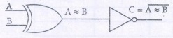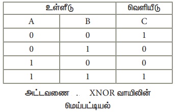 போது இதன் வெளியீடு மெய் ஆகயிருக்கும், அல்லது உள்ளீடுகள் வேவ்வேறாக இருப்பின் வெளியீடு பொய் ஆகயிருக்கும். மாறாக உள்ளீடுகள் சமம். எனில் வெளியீடு 1-ஆகயிருக்கும், இல்லையேல் வெளியீடு 0-ஆகும்.
