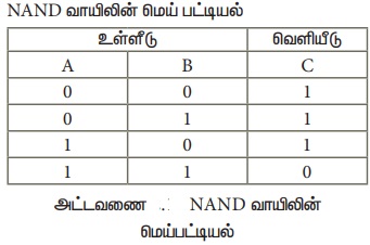 NAND வாயில்: AND வாயிலின் வெளியீட்டை NOT வாயிலுக்கு அனுப்பி பெறும் வெளியீட்டை