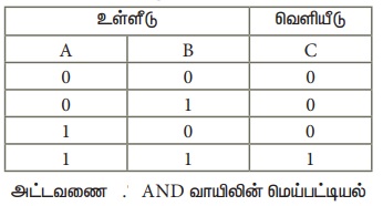 மட்டுமே இதன் வெளியீடு மெய்யாக இருக்கும். அல்லது பொய்யாகிவிடும். அதாவது உள்ளீடுகள் அனைத்தும் 1 என்ற மதிப்பிலிருந்தால் இதன் வெளியீடு 1-ஆக இருக்கும் அல்லது 0 - ஆகிவிடும். A மற்றும் B என்ற மாறிகளில் உள்ளீட்டையும், C என்ற மாறியில் வெளியீட்டையும்
