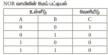 மாற்றிக் கொடுக்கும். இரண்டு உள்ளீட்டுகளும் பொய் எனில், இதன் வெளிபாடுமெய் ஆக இருக்கும். இல்லையெனில் பொய் ஆகும். மாறாக, உள்ளீட்டுகள் அனைத்தும் '0' ஆக இருந்தால் மட்டுமே வெளியீட்டை