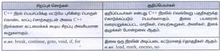 (i) C ++ -நிரல் பெயர்ப்பிக்கு மட்டுமே புரிகின்ற பொருள் கொண்ட காப்பு சொற்களுடன் (reserved words), அவை C++ நிரல்களைக் கட்டமைக்க, சிறப்பு அவசியமான கூறுகளாகும்.