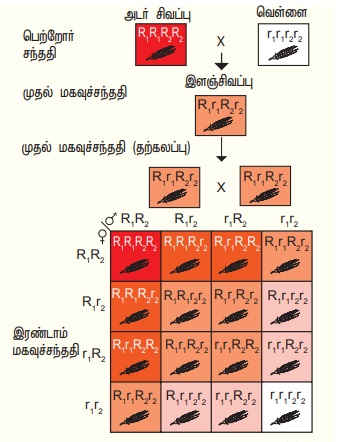 * அடர் சிவப்பு R1R2R2R2 X வெள்ளை நிறம் r1r1r2r2 இக்கலப்பில்