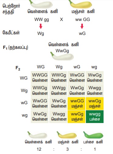 * F1 - ஐப் பொருத்தவரை வெளிப்படாத ஒடுங்கு பண்பு மறைவாயிலிருந்து F2 -வில் மீண்டும் வெளியிட்டது.