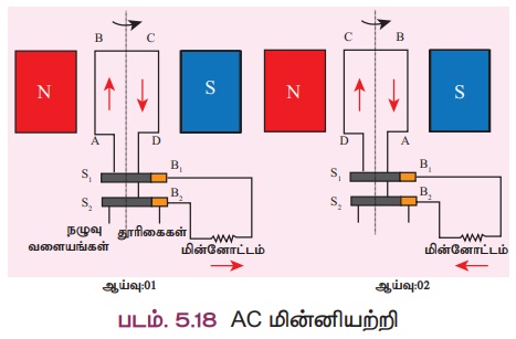 • இந்த மின்னோட்ட திருப்புதல் ஒவ்வொரு அரை சுழற்சியிலும் நிகழ்ந்து கம்பிச்சுருளில் தொடர்ச்சியான சுழற்சியை ஏற்படுத்துகிறது.