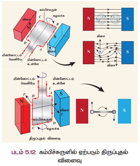 • கம்பிச் சுருளின் இரு முனைகளிலும் விசை எதிரெதிர் திசையில் அமைவதால் அவை சுழல்கின்றன.