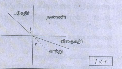 காரணம்: விலகு கதிர் அடர் மிகு ஊடகத்தில் குத்துக்கோட்டை நோக்கி விலகிச் செல்லும்.