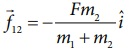 வெக்டர் குறியீட்டின்படி நிறை m1, நிறை m2 மீது செலுத்தும் விசை
