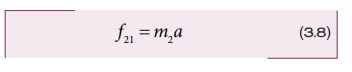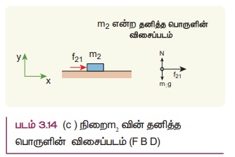 நிறை m2 வைப் பொருத்த வரை x அச்சுத்திசையில் அதன்மீது m1 நிறை ஏற்படுத்தும் ஒரே ஒரு விசை மட்டுமே கிடைத்தளத்திசையில் செயல்படுகிறது. 3.14 (c) ல் நிறை m2 வின் விசைப்படம் காட்டப்பட்டுள்ளது. நிறை m2 விற்கு நியூட்டன் இரண்டாம் விதியைப் பயன்படுத்தினால் f21iˆ = m2aiˆ