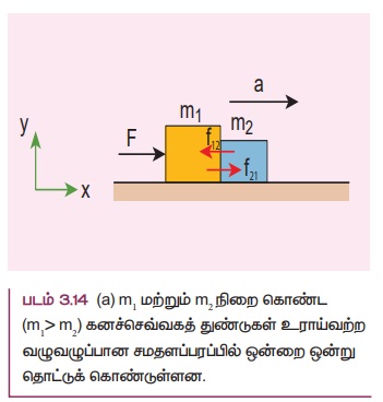 m1 மற்றும் m2 நிறை கொண்ட இரண்டு கனச் செவ்வகத்துண்டுகளைக் கருதுக (m1 > m2) அவை இரண்டும் உராய்வற்ற, வழுவழுப்பான சமதளப்பரப்பில் ஒன்றை ஒன்று தொட்டுக்கொண்டு உள்ளன. (படம் 3.14 (a))