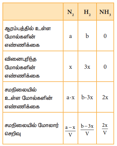 'a' மோல் நைட்ரஜன் மற்றும் ‘b' மோல் ஹைட்ரஜன் ஆகியன ‘V’ கனஅளவுள்ள ஒரு கலனில் எடுத்துக் கொள்ளப்பட்டு அம்மோனியா உருவாக்கப்படும் வினையைக் கருதுக. 'x' மோல் நைட்ரஜன் '3x' மோல் ஹைட்ரஜனுடன் வினைபுரிந்து 2x மோல் அம்மோனியா உருவாகிறது என்க.