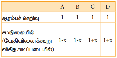 HI உருவாகும் மீள்வினையை நாம் கருதுவோம்.V கொள்ளளவு உடைய கலனில் 'a' மோல் ஹைட்ரஜன் மற்றும் ‘b’ மோல் அயோடின் வாயுக்கள், வினைபுரிய அனுமதிக்கப்படுகின்றன. x மோல் ஹைட்ரஜன் x மோல் அயோடினுடன் வினைபுரிந்து 2x மோல் HIஐ தருவதாகக் கொள்வோம்.