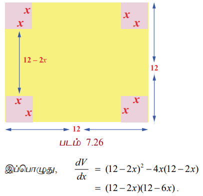 நீளத்தின் இரு மூலைகளிலும் x நீளமுள்ள சதுரத்தை வெட்டிய பின் நீளம் 12-2x. மடித்த பின்பு பெட்டியின் ஆழம் x. எனவே, கன அளவு V = x × (12 - 2x)2 ஆகும். x = 0 அல்லது 6-ல் கன அளவு பூச்சியமாவதைக் கவனிக்க. எனவே, x = 0 அல்லது 6 எனில் பெட்டி கிடைக்காது. எனவே, V = x × (12 - 2x)2 , x∈ (0,6)-ஐ பெருமப்படுத்த வேண்டும்.