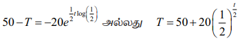 இரு பக்கமும் தொகையிட, log|50 - T| = kt + log C அல்லது 50 - T = Cekt,
