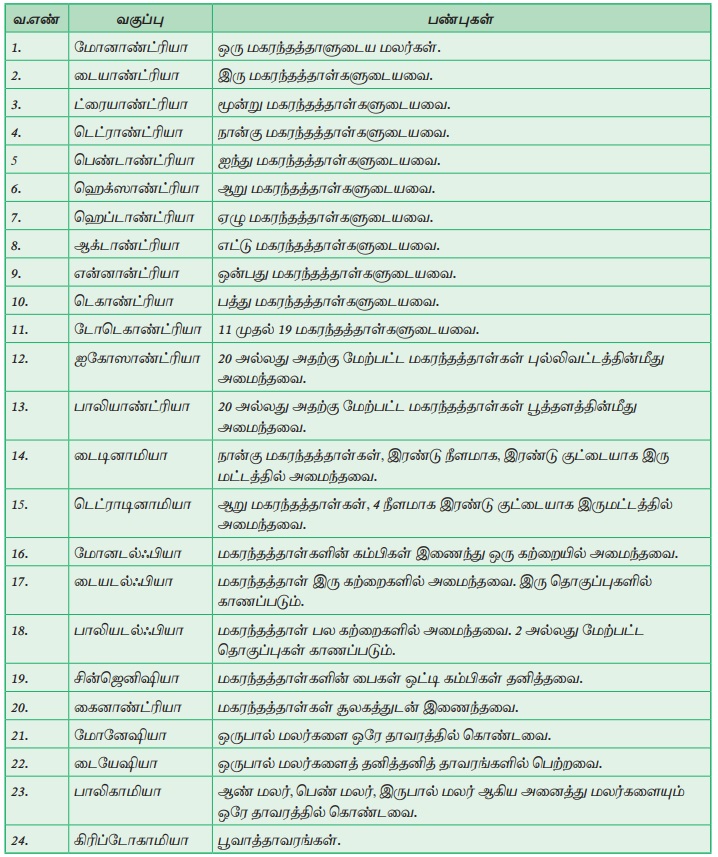 லின்னேயஸ் அவரது "ஸ்பீசிஸ் பிளாண்டாரம்" (1753) என்ற நூலில் மகரந்தத் தாள் மற்றும் பால்பண்புகளின் அடிப்படையில் 24 வகுப்புகளாக வகைப்படுத்தியுள்ளார்