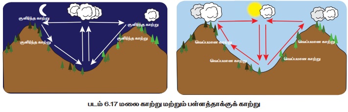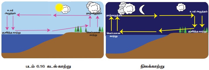 பகல் நேரத்தில் நிலமானது நீரை விட வேகமாக வெப்பமடைகிறது. நிலத்தில் உள்ள காற்று வெப்பமாகிவிரிவடைந்து மேலெழுவதால் தாழ்வழுத்தம் உருவாகிறது. அதே நேரத்தில் கடல் மீது உள்ள காற்று மெதுவாக வெப்பமடையும் காரணத்தினால் உயர் அழுத்தம் உருவாகிறது. காற்றானது உயர் அழுத்தம் உடைய பெருங்கடலில் இருந்து தாழ்வழுத்தம் உடைய நிலப்பகுதியை நோக்கி வீசுகிறது. இதனை கடற்காற்று என அழைக்கிறோம். இந்நிகழ்வு இரவு நேரத்தில் எதிர் மறையாக நிலத்தில் இருந்து கடலை நோக்கி வீசுவதால் இதற்கு நிலக்காற்று என்று பெயர். (படம் 6.16)