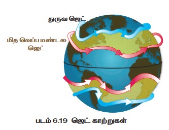 ஜெட் காற்றுகள் என்பது அதிக உயரத்தில் 6கி.மீ.லிருந்து 14 கி.மீ உயரம் வரை வீசக் கூடிய மேற்கத்தியக் காற்று அமைப்பு ஆகும். இது இரண்டு அரைக் கோளங்களிலும் அலை வடிவத்தில் மணிக்கு 450 கி.மீ வேகத்தில் மிக அதிக வேகத்துடன் வீசுகிறது. இவை துருவங்களைச் சுற்றி வருவதால் அதை துருவங்களைச் சுற்றும் காற்று (Circum polar wind system) (படம் 6.19) என அழைக்கிறோம். அதிக உயரத்தில் வீசும் போதும் அவை புவி மேற்பரப்பு வானிலையில் தாக்கத்தை ஏற்படுத்துகிறது.