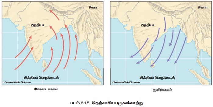 தெற்காசிய பருவக் காற்றானது இமயமலைக்குத் தெற்கு பகுதியில் உள்ள நாடுகளான இந்தியா, பாகிஸ்தான், வங்காளதேசம், இலங்கை, மாலத்தீவு, நேபாளம் மற்றும் பூட்டான் ஆகிய நாடுகளில் வீசுகிறது. இது காற்று உருவாகும் திசையைப் பொருத்து தென்மேற்குப் பருவக்காற்று மற்றும் வடகிழக்கு பருவக்காற்று என இரு பெரும் பிரிவுகளாகப் பிரிக்கப்பட்டு பெயரிடப்பட்டுள்ளது. (படம் 6.15)