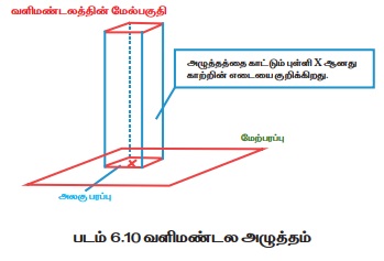 வளிமண்டல அழுத்தம் என்பது புவியின் மேற்பரப்புக்கு மேலே ஒரு அலகு பரப்பில் உள்ள காற்று மூலக்கூறுகளின் எடை ஆகும். கீழே கொடுக்கப்பட்டுள்ள படத்தில் (படம் 6.10) காற்றின் எடை அதிகரிக்கும் போது அழுத்தப் புள்ளியின் மதிப்பும் அதிகரிக்கும். புவியின் மீது வளிமண்டல அழுத்தப்பரவல் சீரான முறையில் இல்லை. புவி மேற்பரப்பில் விசையை செலுத்தும் காற்று மூலக்கூறுகளின் எடைக்கு ஏற்ப அழுத்தம் அதிகரிக்கும் அல்லது குறையும். காற்றின் வெப்பநிலை அதிகரிக்கும் போது காற்று விரிவடைந்து அப்பகுதியில் உள்ள மூலக்கூறுகளின் எண்ணிக்கை குறைகிறது. இதை தொடர்ந்து அழுத்தம் குறைகிறது. சில நேரங்களில் வெப்பநிலை குறையும் போது காற்றின் அழுத்தம் அதிகரிக்கிறது. எனவே வெப்பநிலையும், வளிமண்டல அழுத்தமும் எதிர்மறையான தொடர்புடையது. வளிமண்டல அழுத்தம் அழுத்தமானி (Barometer) என அழைக்கப்படும் கருவியால் அளவிடப்படுகிறது.