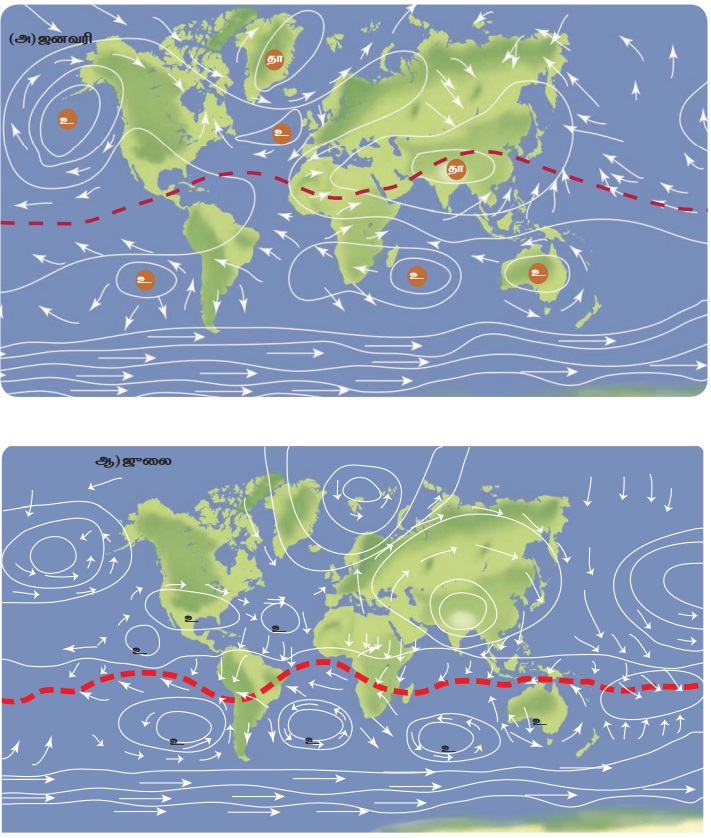 3. நிலம் மற்றும் நீர்ப் பகுதியில் தோன்றும் உயர் மற்றும் தாழ் அழுத்த அமைப்புகள் பருவ காலத்திற்கு ஏற்ப இடம் மாறுதல்.