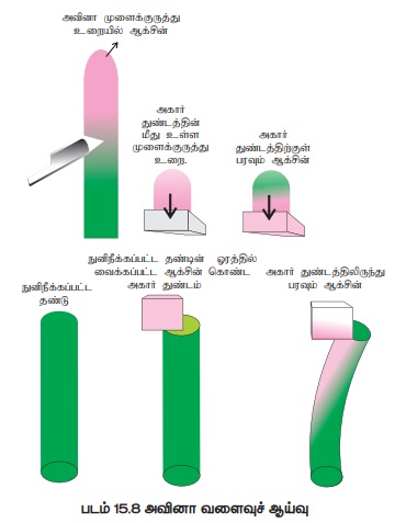 அவினா நாற்றுகள் 15 முதல் 30 மி.மீ உயரமுள்ள போது, 1 மி.மீ அளவுள்ள முளைக்குருத்து உறை நீக்கப்படுகிறது. இது இயற்கை ஆக்சின் உள்ள பகுதியாகும். இந்த நுனிப்பகுதியைச் சிலமணி நேரம் அகார் துண்டத்தின் மீது வைக்கவேண்டும். இதன் காரணமாக நுனிப்பகுதியில் உள்ள ஆக்சின் அகார் துண்டத்திற்குப் பரவுகிறது. நுனி நீக்கப்பட்ட தண்டு நுனியின் ஒரு ஓரத்தில் ஆக்சின் பரவிய அகார் துண்டங்களை வைக்கவும். இத்துண்டத்தை ஒரு பக்கமாக முளைக்குருத்து உறை பகுதியில் வைக்கும் பொழுது ஆக்சின் கீழிறங்குகிறது. மற்றொரு நுனிநீக்கப்பட்ட முளைக்குருத்து உறை மீது ஆக்சின் இல்லாத அகார் துண்டம் வைக்கப்படுகிறது. ஒரு மணி நேரத்திற்குள், ஆக்சின் கொண்ட அகார் துண்டம் வைக்கப்பட்ட நுனிப்பகுதி எதிர் பக்கத்தில் வளைவடையும். இந்த வளைவினைக் கணக்கிட முடியும் (படம் 158).