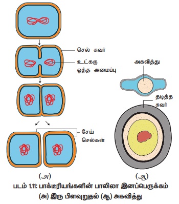 • பாக்டீரியங்கள் இரு பிளவுறுதல், அகவித்துகள் உருவாதல்