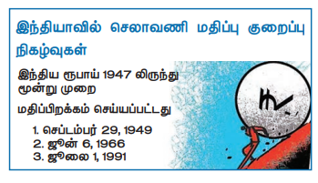 அயல் நாட்டுச் செலுத்துநிலையில் சமமின்மை உள்ள நாடு தன் பணத்தின் மதிப்பை குறைத்து நிர்ணயித்து ஏற்றுமதிக்கு ஊக்கம் கொடுத்து இறக்குமதிக்கான ஊக்கத்தை கெடுத்து செலுத்து சமமின்மையை சரிசெய்யலாம். செலாவணி மதிப்பு குறைப்பு ஏற்றுமதி பொருட்களை மலிவானதாகவும் இறக்குமதி பொருட்களை விலை உயர்ந்தவையாகவும் மாற்றும். பணமதிப்பிறக்கம் இந்திய உணவுப் பொருட்கள் வெளிநாட்டினருக்கு மலிவான விலையிலும் இந்தியர்களுக்கு வெளிநாட்டு பொருட்கள் உயர்ந்த விலையிலும் கிடைக்க செய்கிறது.