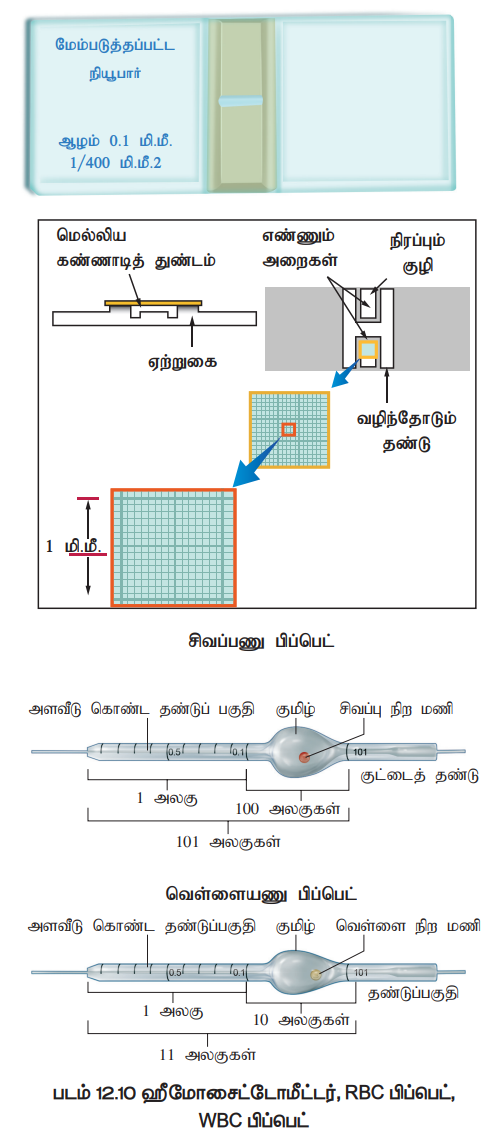 2. WBC பிப்பெட்டில் WBC நீர்க்கச் செய்யும் திரவத்தை 11 என்ற அளவீடு வரையிலும் RBC பிப்பெட்டில் RBC நீர்க்கச் செய்யும் திரவத்தை 101 என்ற அளவீடு வரையிலும் எடுத்துக் கொள்ளப்படுகிறது.