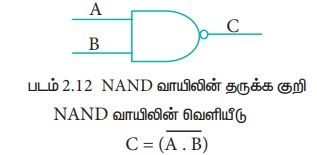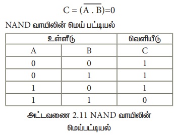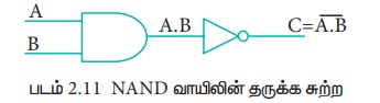 AND வாயிலின் வெளியீட்டை NOT வாயிலுக்கு அனுப்பி பெறும் வெளியீட்டை கொண்டு NAND வாயில் செயற்படும். இதன் தருக்க செயற்பாடு AND வாயிலின் வெளியீட்டை தலைகீழாக பெறும், உள்ளீடுகள் அனைத்தும் "மெய்" எனில், இதன் வெளியீடு "பொய்" ஆகயிருக்கும், இல்லையேல் இதன் வெளியீடு "மெய்” ஆகயிருக்கும். மாறாக உள்ளீட்டுக் அனைத்தும் 1 எனில் NAND வாயிலின் வெளியீடு 0- ஆகயிருக்கும், இல்லையேல் இதன் வெளியீடு 1-ஆகயிருக்கும். NAND வாயிலின் தருக்க சுற்று.